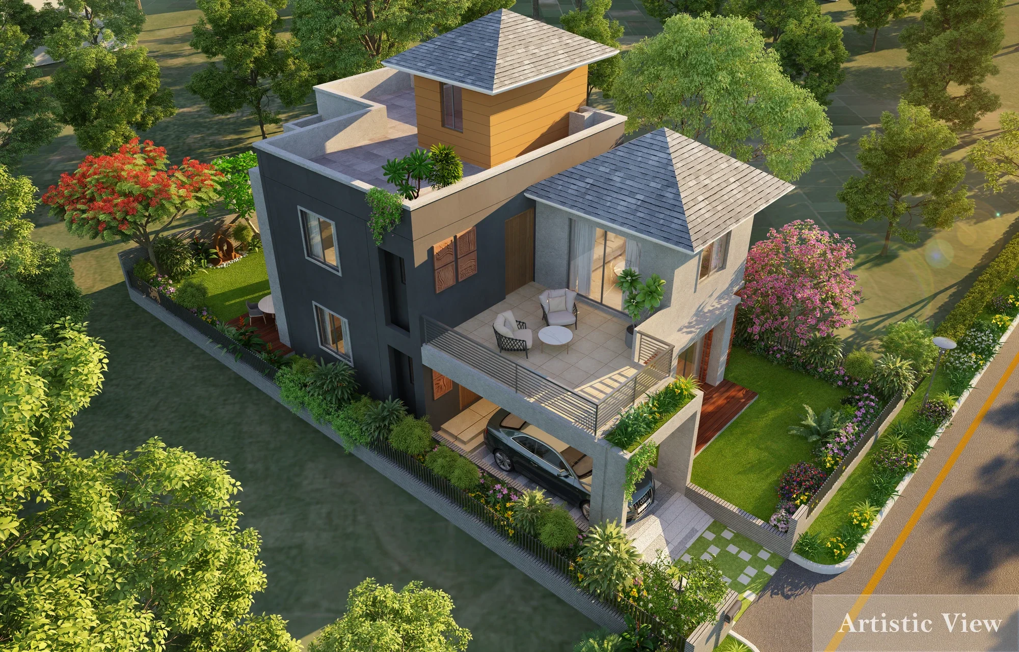 Villas, ranging from 2 to 4.5 kathas, are designed to balance privacy, functionality, and elegance, each with spacious layouts and private lawns. A central clubhouse with indoor sports and leisure amenities fosters community interaction. Surrounded by lush greenery and landscaped gardens, the project seamlessly blends built form and nature, creating a refined, amenity-rich living environment.