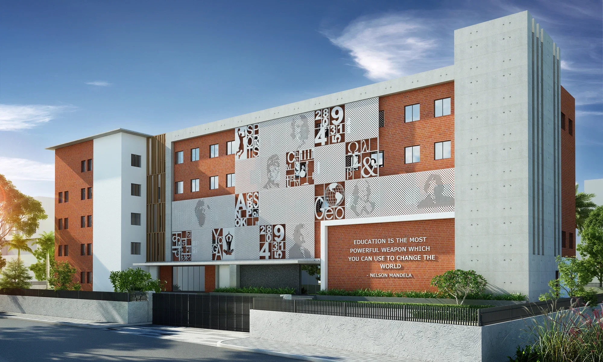 Located on the tranquil outskirts of Kolkata, Spring Field Academy is a G+4 school building that blends contemporary design with functional efficiency. The façade showcases a striking composition of exposed brick and concrete, balancing warmth and raw structural clarity. The brickwork lends a tactile, earthy character that connects with the natural setting, while the concrete elements define form and rhythm. Dialectic and illustrative FRP panels introduce an expressive layer, adding vibrancy and visual depth. Internally, the building houses state-of-the-art learning spaces designed to foster creativity, collaboration, and exploration.